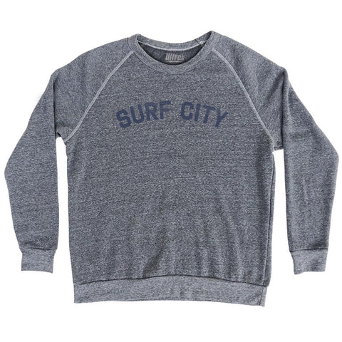 Product Story: Surf City Adult Tri-Blend SweatshirtProduct Description: Surf City Adult Tri-Blend Sweatshirt Tri-Blend (Polyester, Rayon, Cotton) Buttery Smooth Soft Material Medium Weight Tee Soft Hand Print