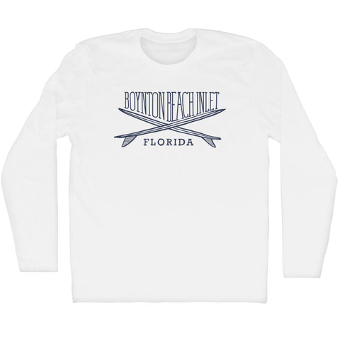 Product Story: Boynton Beach Inlet Surf Break Crossed Surf Board Surfing Destination Adult Cotton Long Sleeve T-ShirtProduct Description: Boynton Beach Inlet Surf Break Crossed Surf Board Surfing Destination Adult Cotton Long Sleeve T-Shirt Cotton Buttery Smooth Soft Material Medium Weight Tee Soft Hand Print