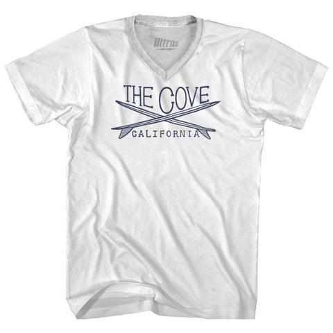 Product Story: The Cove Surf Adult Tri-Blend V-neck T-shirtProduct Description: The Cove Surf Adult Tri-Blend V-neck T-shirt Tri-Blend (Polyester, Rayon, Cotton) Buttery Smooth Soft Material Medium Weight Tee Soft Hand Print