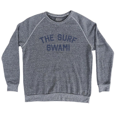 Product Story: The Surf Swami Adult Tri-Blend SweatshirtProduct Description: The Surf Swami Adult Tri-Blend Sweatshirt Tri-Blend (Polyester, Rayon, Cotton) Buttery Smooth Soft Material Medium Weight Tee Soft Hand Print
