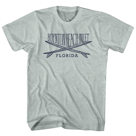 Product Story: Boynton Beach Inlet Surf Break Crossed Surf Board Surfing Destination Adult Tri-Blend T-ShirtProduct Description: Boynton Beach Inlet Surf Break Crossed Surf Board Surfing Destination Adult Tri-Blend T-Shirt Tri-Blend (Polyester, Rayon, Cotton) Buttery Smooth Soft Material Medium Weight Tee Soft Hand Print