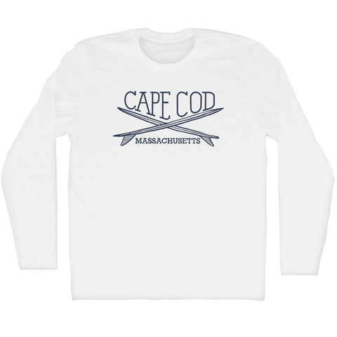 Product Story: Cape Cod Surf Break Crossed Surf Board Surfing Destination Adult Cotton Long Sleeve T-ShirtProduct Description: Cape Cod Surf Break Crossed Surf Board Surfing Destination Adult Cotton Long Sleeve T-Shirt Cotton Buttery Smooth Soft Material Medium Weight Tee Soft Hand Print