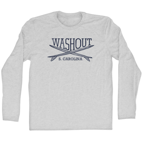 Product Story: Washout Surf Break Crossed Surf Board Surfing Destination Adult Tri-Blend Long Sleeve T-ShirtProduct Description: Washout Surf Break Crossed Surf Board Surfing Destination Adult Tri-Blend Long Sleeve T-Shirt Tri-Blend (Polyester, Rayon, Cotton) Buttery Smooth Soft Material Medium Weight Tee Soft Hand Print