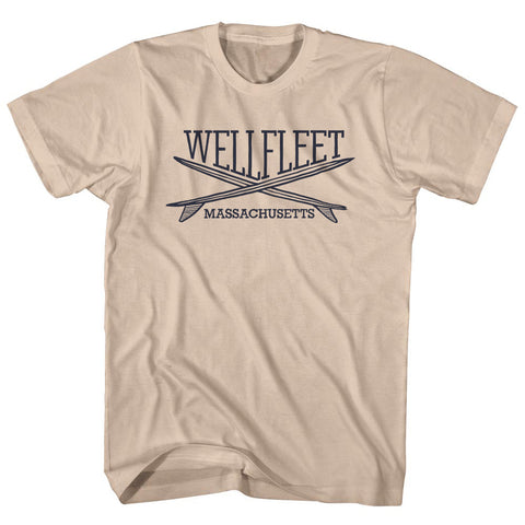 Product Story: Wellfleet Surf Break Crossed Surf Board Surfing Destination Adult Cotton T-ShirtProduct Description: Wellfleet Surf Break Crossed Surf Board Surfing Destination Adult Cotton T-Shirt Cotton Buttery Smooth Soft Material Medium Weight Tee Soft Hand Print
