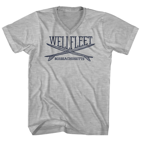 Product Story: Wellfleet Surf Break Crossed Surf Board Surfing Destination Adult Tri-Blend V-Neck T-ShirtProduct Description: Wellfleet Surf Break Crossed Surf Board Surfing Destination Adult Tri-Blend V-Neck T-Shirt Tri-Blend (Polyester, Rayon, Cotton) Buttery Smooth Soft Material Medium Weight Tee Soft Hand Print