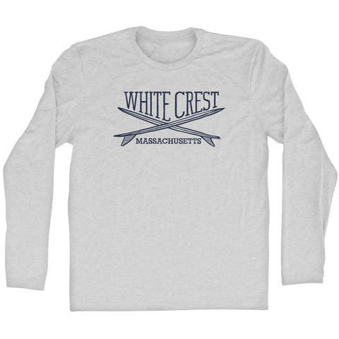 Product Story: White Surf Break Crossed Surf Board Surfing Destination Adult Tri-Blend Long Sleeve T-ShirtProduct Description: White Surf Break Crossed Surf Board Surfing Destination Adult Tri-Blend Long Sleeve T-Shirt Tri-Blend (Polyester, Rayon, Cotton) Buttery Smooth Soft Material Medium Weight Tee Soft Hand Print
