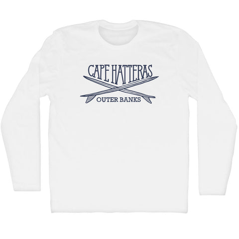 Product Story: Cape Hatteras Surf Break Crossed Surf Board Surfing Destination Adult Cotton Long Sleeve T-ShirtProduct Description: Cape Hatteras Surf Break Crossed Surf Board Surfing Destination Adult Cotton Long Sleeve T-Shirt Cotton Buttery Smooth Soft Material Medium Weight Tee Soft Hand Print