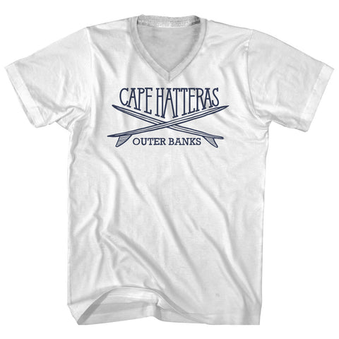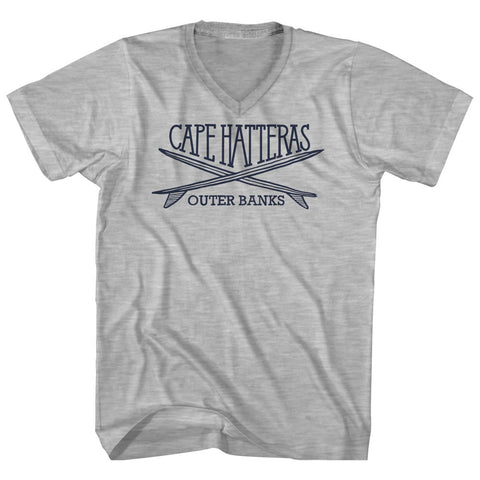 Product Story: Cape Hatteras Surf Break Crossed Surf Board Surfing Destination Adult Cotton V-Neck T-ShirtProduct Description: Cape Hatteras Surf Break Crossed Surf Board Surfing Destination Adult Cotton V-Neck T-Shirt Tri-Blend (Polyester, Rayon, Cotton) Buttery Smooth Soft Material Medium Weight Tee Soft Hand Print