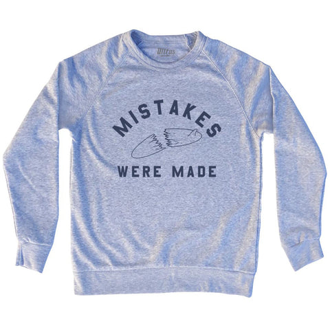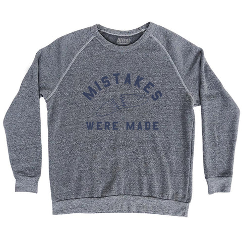 Product Story: Mistakes Were Made Broken Surf Board Adult Tri-Blend SweatshirtProduct Description: Mistakes Were Made Broken Surf Board Adult Tri-Blend Sweatshirt Tri-Blend (Polyester, Rayon, Cotton) Buttery Smooth Soft Material Medium Weight Tee Soft Hand Print