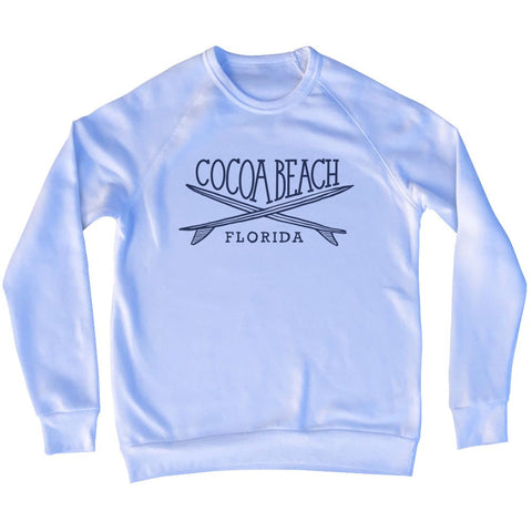 Product Story: Cocoa Beach Surf Break Crossed Surf Board Surfing Destination Adult Tri-Blend SweatshirtProduct Description: Cocoa Beach Surf Break Crossed Surf Board Surfing Destination Adult Tri-Blend Sweatshirt Cotton Buttery Smooth Soft Material Medium Weight Tee Soft Hand Print
