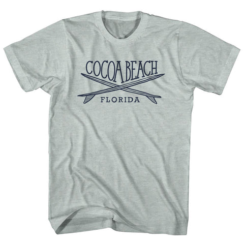 Product Story: Cocoa Beach Surf Break Crossed Surf Board Surfing Destination Adult Tri-Blend T-ShirtProduct Description: Cocoa Beach Surf Break Crossed Surf Board Surfing Destination Adult Tri-Blend T-Shirt Tri-Blend (Polyester, Rayon, Cotton) Buttery Smooth Soft Material