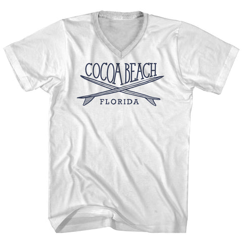 Product Story: Cocoa Beach Surf Break Crossed Surf Board Surfing Destination Adult Cotton V-Neck T-ShirtProduct Description: Cocoa Beach Surf Break Crossed Surf Board Surfing Destination Adult Cotton V-Neck T-Shirt Cotton Buttery Smooth Soft Material Medium Weight Tee Soft Hand Print