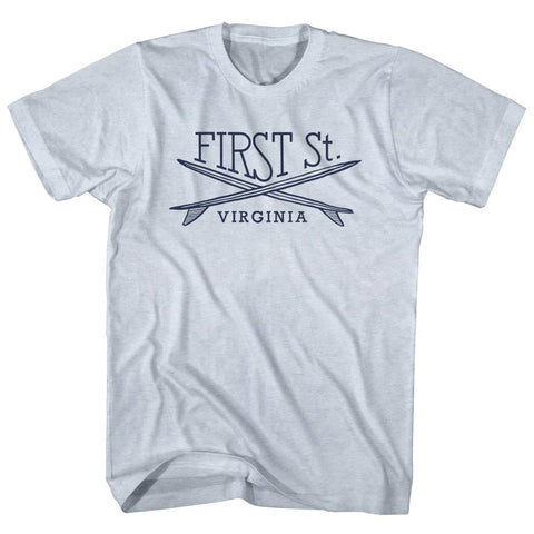 Product Story: First St. Surf Break Crossed Surf Board Surfing Destination Adult Tri-Blend T-ShirtProduct Description: First St. Surf Break Crossed Surf Board Surfing Destination Adult Tri-Blend T-Shirt Tri-Blend (Polyester, Rayon, Cotton) Buttery Smooth Soft Material Medium Weight Tee Soft Hand Print