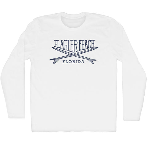 Product Story: Flagler Surf Break Crossed Surf Board Surfing Destination Adult Cotton Long Sleeve T-ShirtProduct Description: Flagler Surf Break Crossed Surf Board Surfing Destination Adult Cotton Long Sleeve T-Shirt Cotton Buttery Smooth Soft Material Medium Weight Tee Soft Hand Print