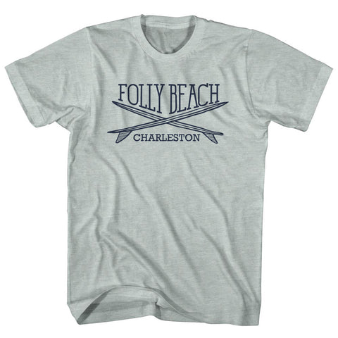 Product Story: Folly Beach Surf Break Crossed Surf Board Surfing Destination Adult Tri-Blend T-ShirtProduct Description: Folly Beach Surf Break Crossed Surf Board Surfing Destination Adult Tri-Blend T-Shirt Tri-Blend (Polyester, Rayon, Cotton) Buttery Smooth Soft Material