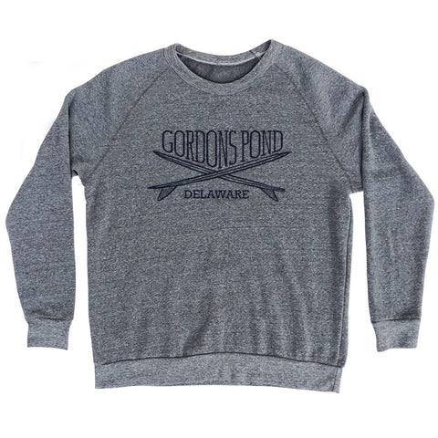 Product Story: Gordons Pond Surf Break Crossed Surf Board Surfing Destination Adult Tri-Blend SweatshirtProduct Description: Gordons Pond Surf Break Crossed Surf Board Surfing Destination Adult Tri-Blend Sweatshirt Cotton Buttery Smooth Soft Material Medium Weight Tee Soft Hand Print
