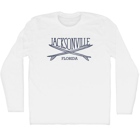 Product Story: Jacksonville Surf Break Crossed Surf Board Surfing Destination Adult Cotton Long Sleeve T-ShirtProduct Description: Jacksonville Surf Break Crossed Surf Board Surfing Destination Adult Cotton Long Sleeve T-Shirt Cotton Buttery Smooth Soft Material Medium Weight Tee Soft Hand Print