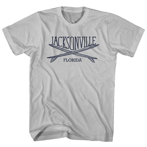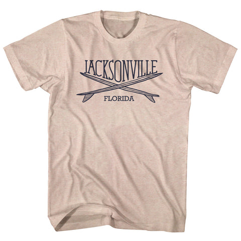 Product Story: Jacksonville Surf Break Crossed Surf Board Surfing Destination Adult Cotton T-ShirtProduct Description: Jacksonville Surf Break Crossed Surf Board Surfing Destination Adult Cotton T-Shirt Cotton Buttery Smooth Soft Material Medium Weight Tee Soft Hand Print