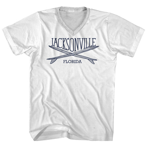 Product Story: Jacksonville Surf Break Crossed Surf Board Surfing Destination Adult Cotton V-Neck T-ShirtProduct Description: Jacksonville Surf Break Crossed Surf Board Surfing Destination Adult Cotton V-Neck T-Shirt Cotton Buttery Smooth Soft Material Medium Weight Tee Soft Hand Print