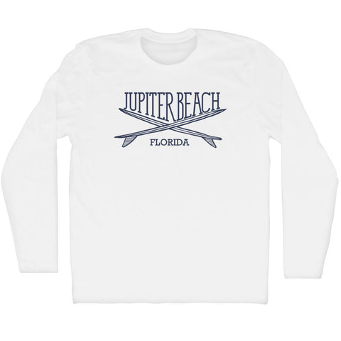 Product Story: Jupiter Beach Surf Break Crossed Surf Board Surfing Destination Adult Cotton Long Sleeve T-ShirtProduct Description: Jupiter Beach Surf Break Crossed Surf Board Surfing Destination Adult Cotton Long Sleeve T-Shirt Cotton Buttery Smooth Soft Material Medium Weight Tee Soft Hand Print