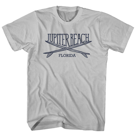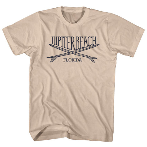 Product Story: Jupiter Beach Surf Break Crossed Surf Board Surfing Destination Adult Cotton T-ShirtProduct Description: Jupiter Beach Surf Break Crossed Surf Board Surfing Destination Adult Cotton T-Shirt Cotton Buttery Smooth Soft Material Medium Weight Tee Soft Hand Print