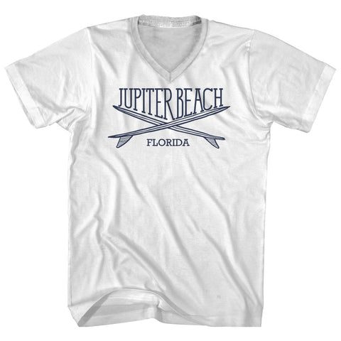 Product Story: Jupiter Beach Surf Break Crossed Surf Board Surfing Destination Adult Cotton V-Neck T-ShirtProduct Description: Jupiter Beach Surf Break Crossed Surf Board Surfing Destination Adult Cotton V-Neck T-Shirt Cotton Buttery Smooth Soft Material Medium Weight Tee Soft Hand Print