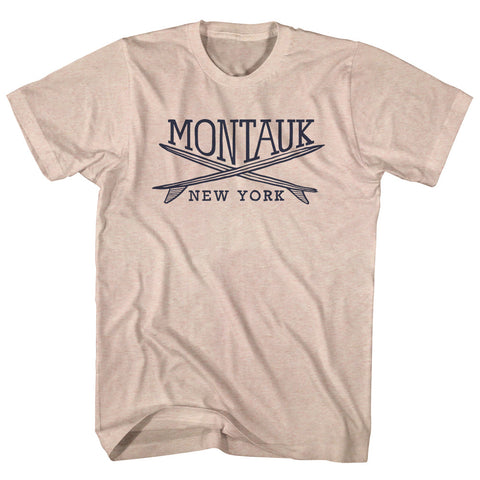 Product Story: Montauk Surf Break Crossed Surf Board Surfing Destination Adult Tri-Blend T-ShirtProduct Description: Montauk Surf Break Crossed Surf Board Surfing Destination Adult Tri-Blend T-Shirt Tri-Blend (Polyester, Rayon, Cotton) Buttery Smooth Soft Material