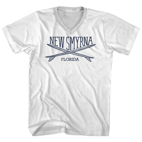 Product Story: New Smyrna Surf Break Crossed Surf Board Surfing Destination Adult Cotton V-Neck T-ShirtProduct Description: New Smyrna Surf Break Crossed Surf Board Surfing Destination Adult Cotton V-Neck T-Shirt Cotton Buttery Smooth Soft Material Medium Weight Tee Soft Hand Print