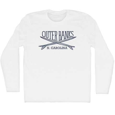 Product Story: Outer Banks Surf Break Crossed Surf Board Surfing Destination Adult Cotton Long Sleeve T-ShirtProduct Description: Outer Banks Surf Break Crossed Surf Board Surfing Destination Adult Cotton Long Sleeve T-Shirt Cotton Buttery Smooth Soft Material Medium Weight Tee Soft Hand Print