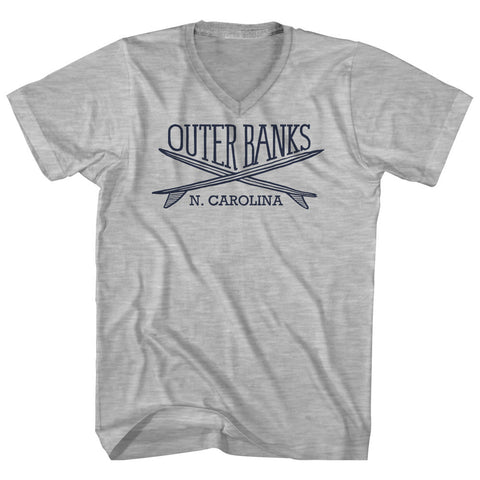 Product Story: Outer Banks Surf Break Crossed Surf Board Surfing Destination Adult Cotton V-Neck T-ShirtProduct Description: Outer Banks Surf Break Crossed Surf Board Surfing Destination Adult Cotton V-Neck T-Shirt Tri-Blend (Polyester, Rayon, Cotton) Buttery Smooth Soft Material Medium Weight Tee Soft Hand Print