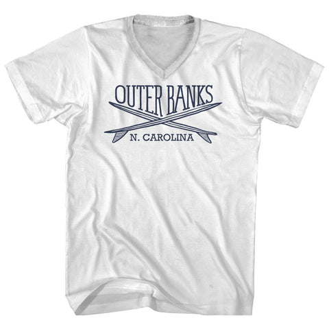 Product Story: Outer Banks Surf Break Crossed Surf Board Surfing Destination Adult Cotton V-Neck T-ShirtProduct Description: Outer Banks Surf Break Crossed Surf Board Surfing Destination Adult Cotton V-Neck T-Shirt Cotton Buttery Smooth Soft Material Medium Weight Tee Soft Hand Print