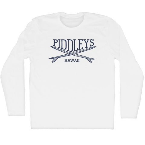 Product Story: Piddleys Surf Break Crossed Surf Board Surfing Destination Adult Tri-Blend Long Sleeve T-ShirtProduct Description: Piddleys Surf Break Crossed Surf Board Surfing Destination Adult Tri-Blend Long Sleeve T-Shirt Tri-Blend (Polyester, Rayon, Cotton) Buttery Smooth Soft Material Medium Weight Tee Soft Hand Print