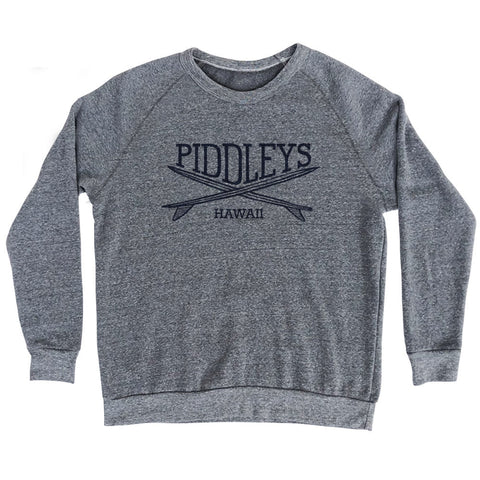 Product Story: Piddleys Surf Break Crossed Surf Board Surfing Destination Adult Tri-Blend SweatshirtProduct Description: Piddleys Surf Break Crossed Surf Board Surfing Destination Adult Tri-Blend Sweatshirt Cotton Buttery Smooth Soft Material Medium Weight Tee Soft Hand Print