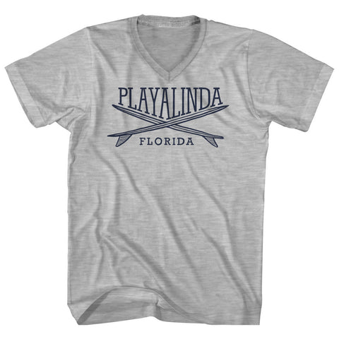 Product Story: Playalinda Surf Break Crossed Surf Board Surfing Destination Adult Cotton V-Neck T-ShirtProduct Description: Playalinda Surf Break Crossed Surf Board Surfing Destination Adult Cotton V-Neck T-Shirt Tri-Blend (Polyester, Rayon, Cotton) Buttery Smooth Soft Material Medium Weight Tee Soft Hand Print