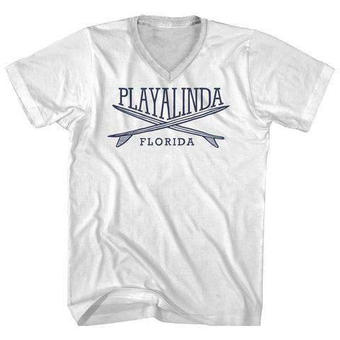 Product Story: Playalinda Surf Break Crossed Surf Board Surfing Destination Adult Cotton V-Neck T-ShirtProduct Description: Playalinda Surf Break Crossed Surf Board Surfing Destination Adult Cotton V-Neck T-Shirt Cotton Buttery Smooth Soft Material Medium Weight Tee Soft Hand Print