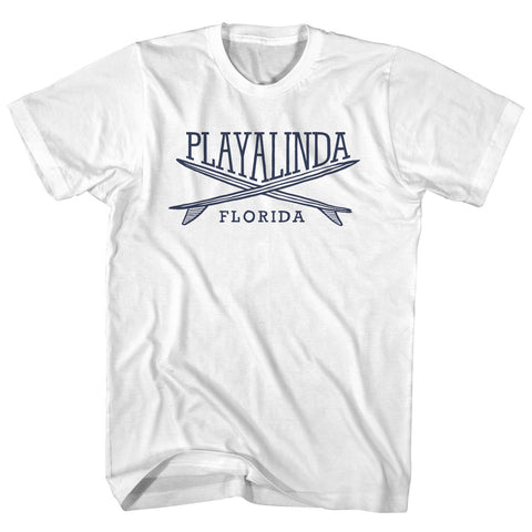 Product Story: Playalinda Surf Break Crossed Surf Board Surfing Destination Adult Tri-Blend T-ShirtProduct Description: Playalinda Surf Break Crossed Surf Board Surfing Destination Adult Tri-Blend T-Shirt Tri-Blend (Polyester, Rayon, Cotton) Buttery Smooth Soft Material