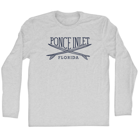 Product Story: Ponce Inlet Surf Break Crossed Surf Board Surfing Destination Adult Tri-Blend Long Sleeve T-ShirtProduct Description: Ponce Inlet Surf Break Crossed Surf Board Surfing Destination Adult Tri-Blend Long Sleeve T-Shirt Tri-Blend (Polyester, Rayon, Cotton) Buttery Smooth Soft Material Medium Weight Tee Soft Hand Print