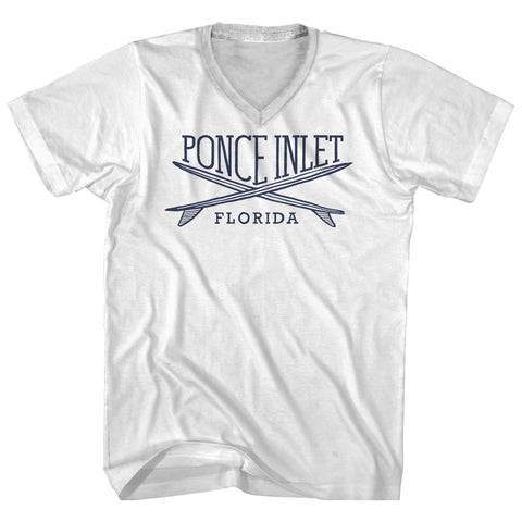 Product Story: Ponce Inlet Surf Break Crossed Surf Board Surfing Destination Adult Cotton V-Neck T-ShirtProduct Description: Ponce Inlet Surf Break Crossed Surf Board Surfing Destination Adult Cotton V-Neck T-Shirt Cotton Buttery Smooth Soft Material Medium Weight Tee Soft Hand Print