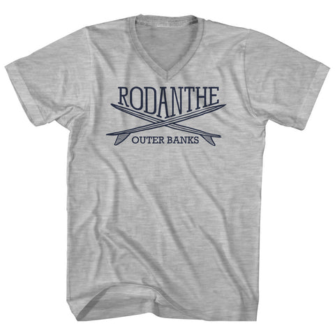 Product Story: Rodanthe Surf Break Crossed Surf Board Surfing Destination Adult Cotton V-Neck T-ShirtProduct Description: Rodanthe Surf Break Crossed Surf Board Surfing Destination Adult Cotton V-Neck T-Shirt Tri-Blend (Polyester, Rayon, Cotton) Buttery Smooth Soft Material Medium Weight Tee Soft Hand Print