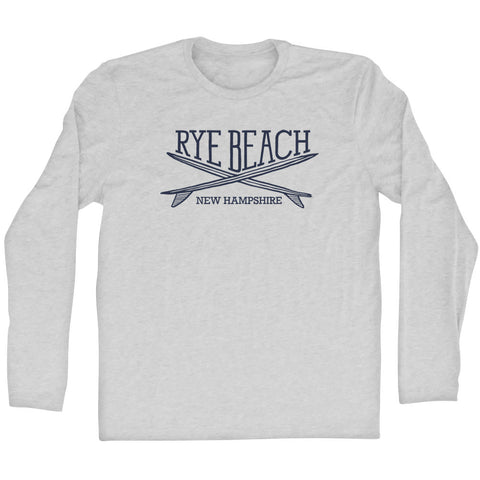 Product Story: Rye Beach Surf Break Crossed Surf Board Surfing Destination Adult Tri-Blend Long Sleeve T-ShirtProduct Description: Rye Beach Surf Break Crossed Surf Board Surfing Destination Adult Tri-Blend Long Sleeve T-Shirt Tri-Blend (Polyester, Rayon, Cotton) Buttery Smooth Soft Material Medium Weight Tee Soft Hand Print