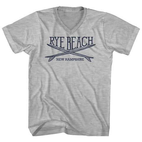 Product Story: Rye Beach Surf Break Crossed Surf Board Surfing Destination Adult Cotton V-Neck T-ShirtProduct Description: Rye Beach Surf Break Crossed Surf Board Surfing Destination Adult Cotton V-Neck T-Shirt Tri-Blend (Polyester, Rayon, Cotton) Buttery Smooth Soft Material Medium Weight Tee Soft Hand Print