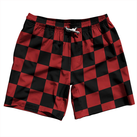 Product Story: Checkerboard 2.5 Inches Black and Red Dark Swim Shorts 7" Made in USAProduct Description: Checkerboard 2.5 Inches Black and Red Dark Swim Shorts 7" Made in USA 7'' Inseam & 20" Tall Swim Trunks Board Shorts Bathing Suits Swim Suits Quick Drying Material Stretch Polyester Elastic Waistband Drawstring Side Pockets Made In USA