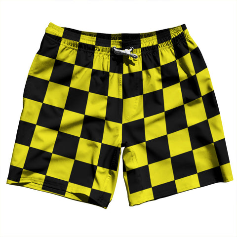 Product Story: Checkerboard 2.5 Inches Black and Yellow Swim Shorts 7" Made in USAProduct Description: Checkerboard 2.5 Inches Black and Yellow Swim Shorts 7" Made in USA 7'' Inseam & 20" Tall Swim Trunks Board Shorts Bathing Suits Swim Suits Quick Drying Material Stretch Polyester Elastic Waistband Drawstring Side Pockets Made In USA