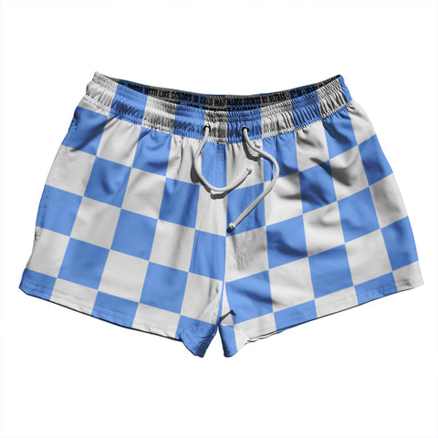 Product Story: Checkerboard 2.5 Inches Blue Carolina and White 2.5" Swim Shorts Made in USAProduct Description: Checkerboard 2.5 Inches Blue Carolina and White 2.5" Swim Shorts Made in USA Stripe 2.50" Inseam Swim Shorts Swim Trunks Board Shorts Bathing Suits Swim Suits Quick Drying Material Stretch Polyester Elastic Waistband Drawstring Side Pockets Made In USA