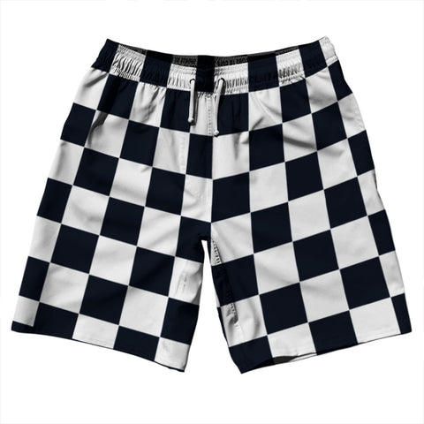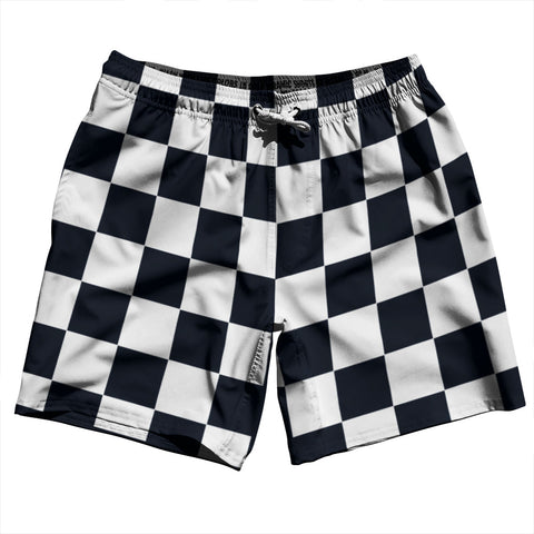Product Story: Checkerboard 2.5 Inches Blue Navy Almost Black and White Swim Shorts 7" Made in USAProduct Description: Checkerboard 2.5 Inches Blue Navy Almost Black and White Swim Shorts 7" Made in USA 7'' Inseam & 20" Tall Swim Trunks Board Shorts Bathing Suits Swim Suits Quick Drying Material Stretch Polyester Elastic Waistband Drawstring Side Pockets Made In USA