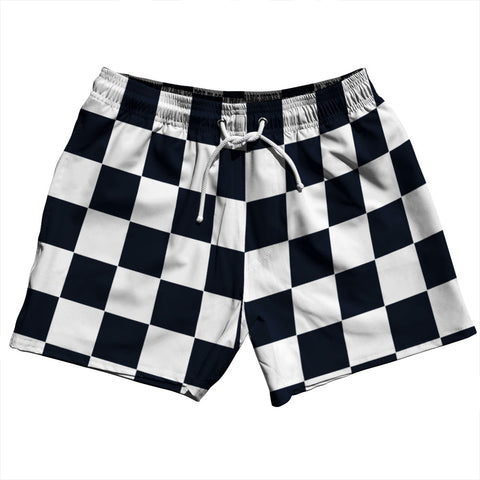 Product Story: Checkerboard 2.5 Inches Blue Navy Almost Black and White 5" Swim Shorts Made in USAProduct Description: Checkerboard 2.5 Inches Blue Navy Almost Black and White 5" Swim Shorts Made in USA 5" Inseam & 17.5" Tall Swim Trunks Board Shorts Bathing Suits Swim Suits Quick Drying Material Stretch Polyester Elastic Waistband Drawstring Side Pockets Made In USA