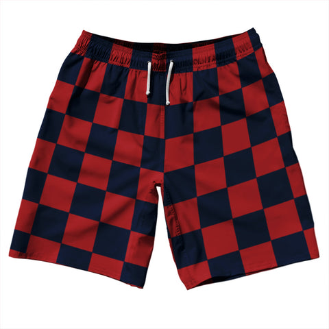Product Story: Checkerboard 2.5 Inches Blue Navy and Red Dark 10" Swim Shorts Made in USAProduct Description: Checkerboard 2.5 Inches Blue Navy and Red Dark 10" Swim Shorts Made in USA Stripe 10" Inseam Swim Shorts Swim Trunks Board Shorts Bathing Suits Swim Suits Quick Drying Material Stretch Polyester Elastic Waistband Drawstring Side Pockets Made In USA