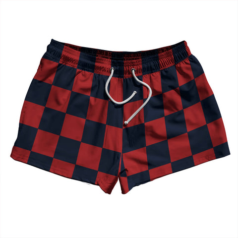 Product Story: Checkerboard 2.5 Inches Blue Navy and Red Dark 2.5" Swim Shorts Made in USAProduct Description: Checkerboard 2.5 Inches Blue Navy and Red Dark 2.5" Swim Shorts Made in USA Stripe 2.50" Inseam Swim Shorts Swim Trunks Board Shorts Bathing Suits Swim Suits Quick Drying Material Stretch Polyester Elastic Waistband Drawstring Side Pockets Made In USA
