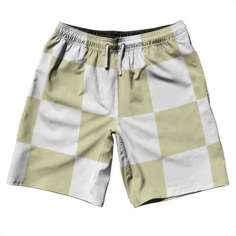 Product Story: Checkerboard 5 Inches Vegas Gold and White Swim Shorts 7" Made in USAProduct Description: Checkerboard 5 Inches Vegas Gold and White Swim Shorts 7" Made in USA 7'' Inseam & 20" Tall Swim Trunks Board Shorts Bathing Suits Swim Suits Quick Drying Material Stretch Polyester Elastic Waistband Drawstring Side Pockets Made In USA