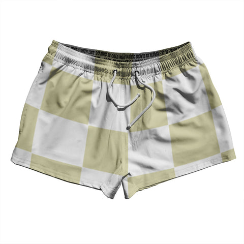 Product Story: Checkerboard 5 Inches Vegas Gold and White 2.5" Swim Shorts Made in USAProduct Description: Checkerboard 5 Inches Vegas Gold and White 2.5" Swim Shorts Made in USA Stripe 2.50" Inseam Swim Shorts Swim Trunks Board Shorts Bathing Suits Swim Suits Quick Drying Material Stretch Polyester Elastic Waistband Drawstring Side Pockets Made In USA